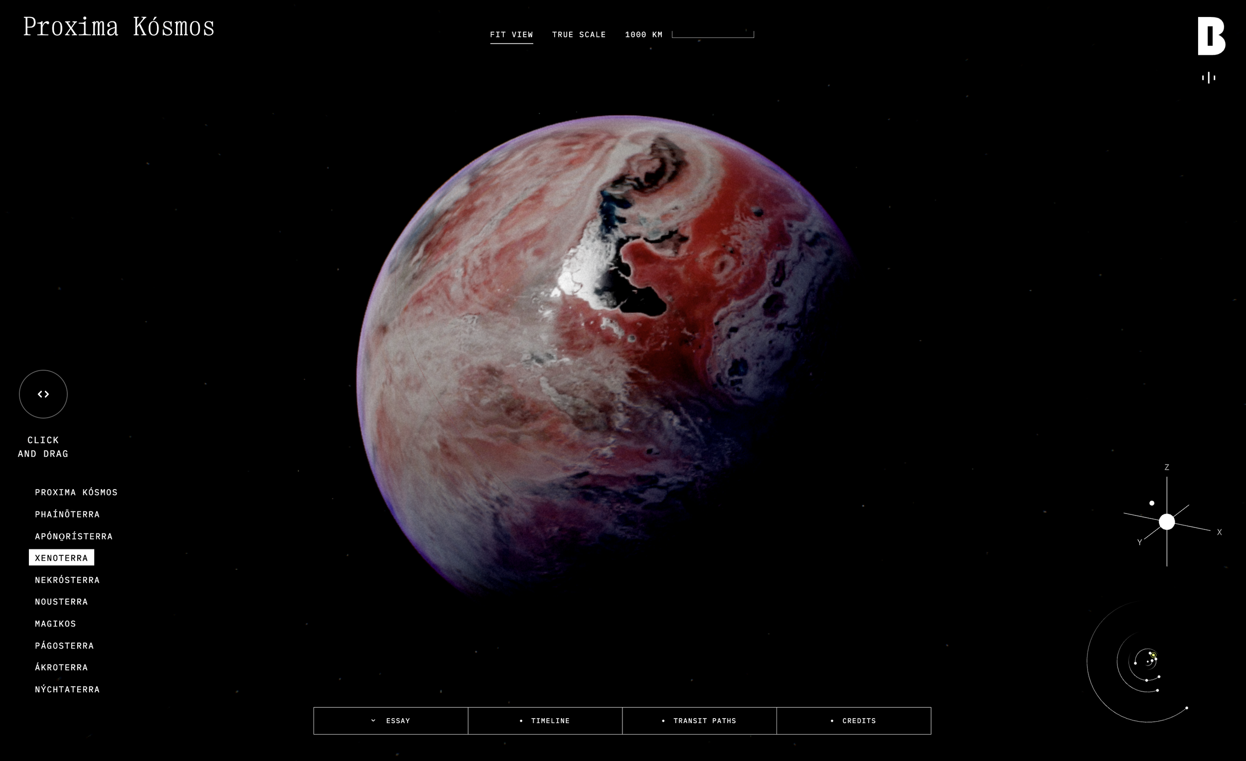 As a work in progress, there are only three fully developed planets in Proxima Kósmos, each with specific scientific findings, hypotheses, timelines, simulations, and even essays and fictions available for further exploration. However, the remaining planets ask questions that are equally critical to human’s understanding of life.